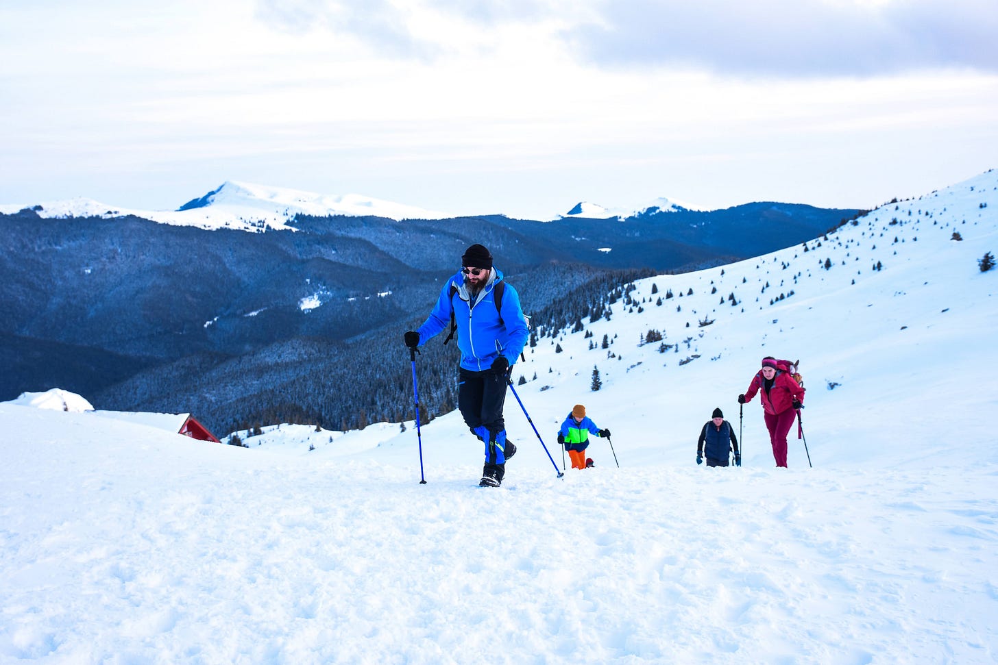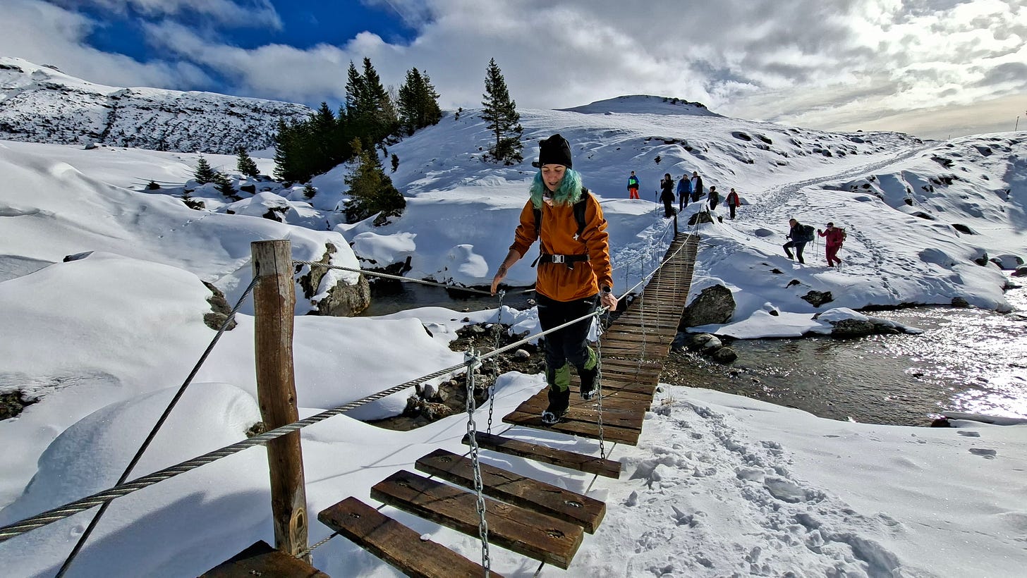 drumeții pe zăpadă în peisajul spectaculos al Bucegilor,